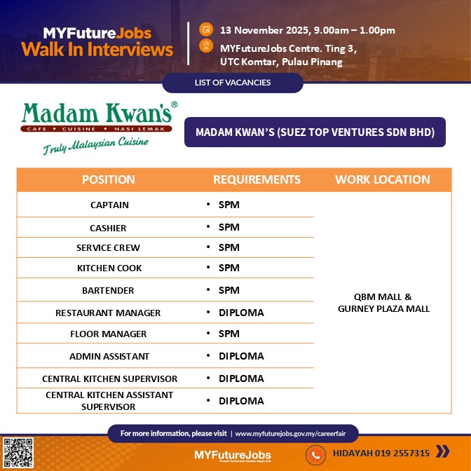 📍 Myfuturejobs Centre,Tingkat 3 UTC Komtar Pulau Pinang