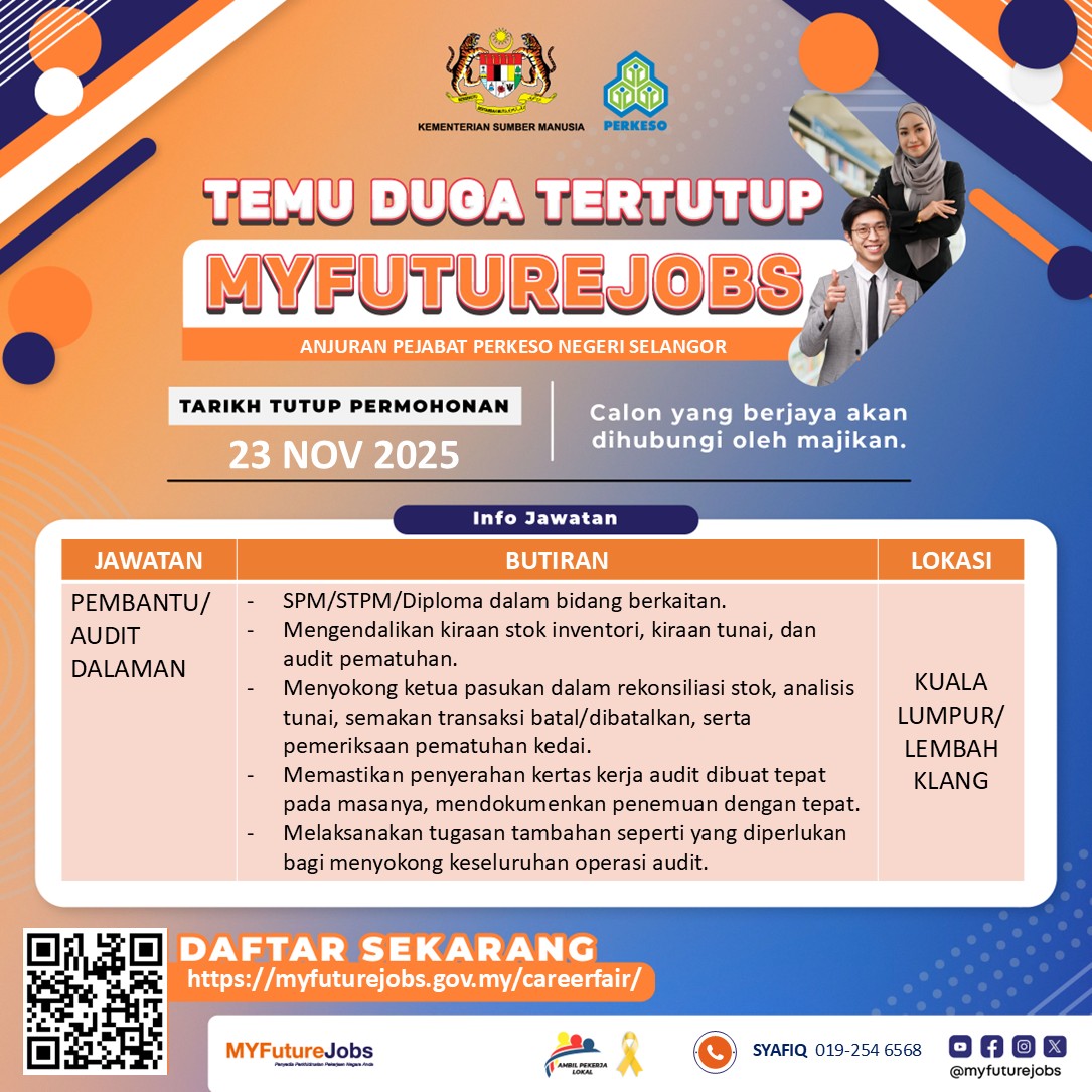 Calon dikehendaki berpakaian kemas dan membawa bersama salinan Resume/CV serta sijil-sijil berkaitan semasa hari temu duga.