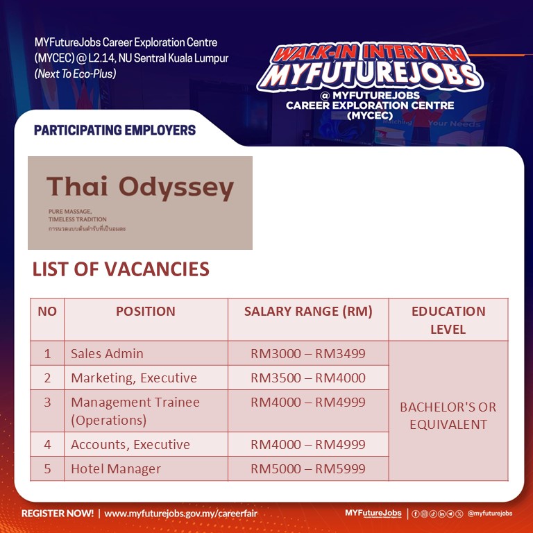 #PERKESO #MYFutureJobs #MYCEC #WalkInInterview #ThaiOdyssey #WeAreHiring #KerjaKosong