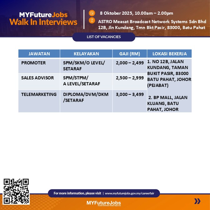 Maklumat lanjut boleh hubungi Encik Aiman di talian wasap.my/60192541492/jawatankosongAstroBatuPahat