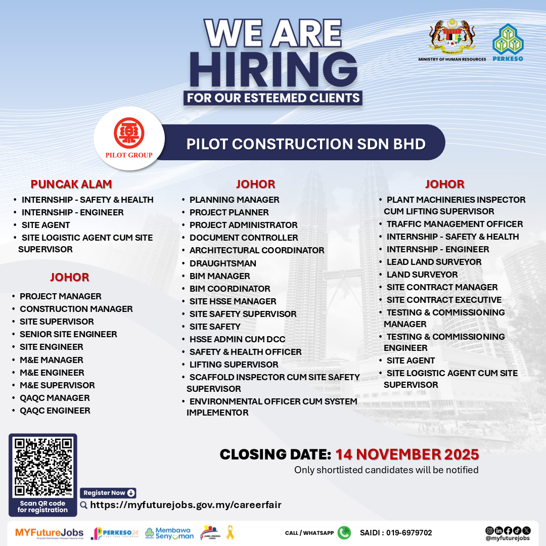 Pilot Construction is looking for passionate and driven individuals to join their team across various positions in Johor, Puncak Alam, and their headquarters in Setia Alam.