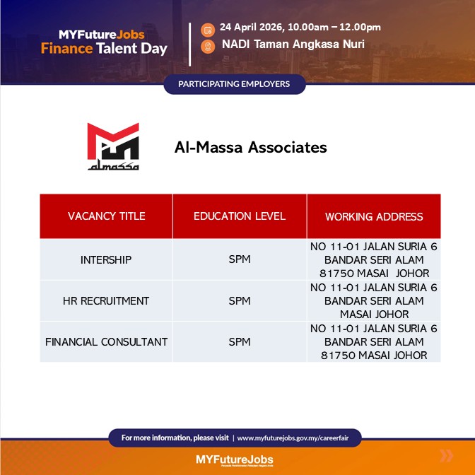 Jangan lepaskan peluang untuk membina kerjaya dalam bidang kewangan bersama Al-Massa Associates.