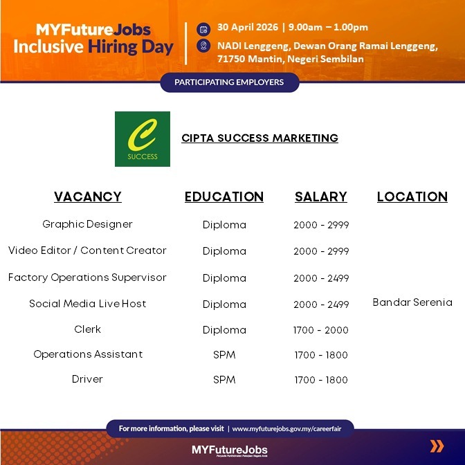 Kongsikan iklan jawatan ini pada rakan, saudara, keluarga dan kita sama sama bantu mereka yang sedang mencari kerja. Akhir kata, Selamat maju jaya kepada semua pencari kerja.