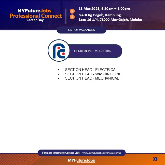 Jom sertai sesi temu duga terbuka dan rebut peluang kerjaya menarik bersama FE Green PET (M) Sdn. Bhd.!