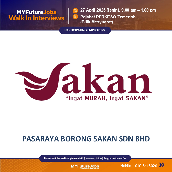 Pasaraya Borong Sakan Sdn. Bhd. kini membuka peluang kepada calon-calon yang berkelayakan untuk menyertai sesi temu duga terbuka MyFutureJobs yang dianjurkan oleh PERKESO Temerloh.