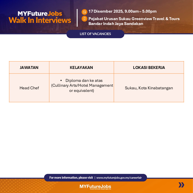 MYFUTUREJOBS WALK-IN INTERVIEW (CASE AMANGEMENT) BERSAMA SUKAU GREENVIEW TRAVEL & TOURS