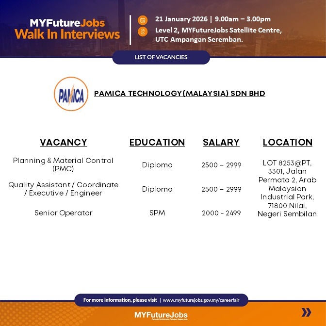 📌Lokasi : Pusat Satelit MYFutureJobs, Tingkat 2, UTC Ampangan Seremban