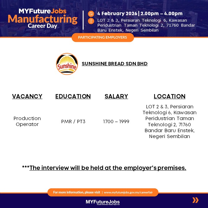 📌Link permohonan : https://tinyurl.com/4FEB2026SUNSHINEBREADSDNBHD