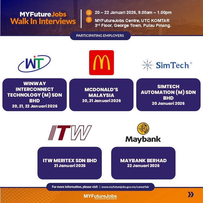 TEMUDUGA MELIBATKAN 5 MAJIKAN TERKEMUKA DI PULAU PINANG, KHAS UNTUK ANDA! BUAT PENCARI KERJA DARI SEKTOR PEMBUATAN, KEWANGAN DAN F&B, JANGAN LEPASKAN PELUANG INI!