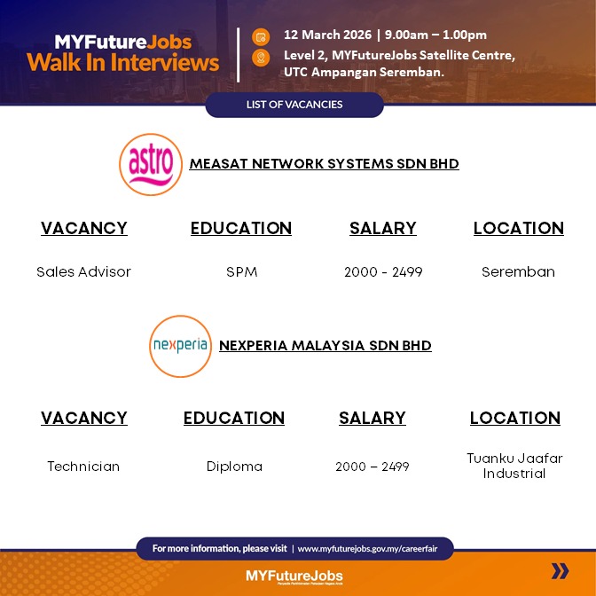 πLokasi Temu Duga : Pusat Satelit MYFutureJobs, Tingkat 2, UTC Ampangan Seremban