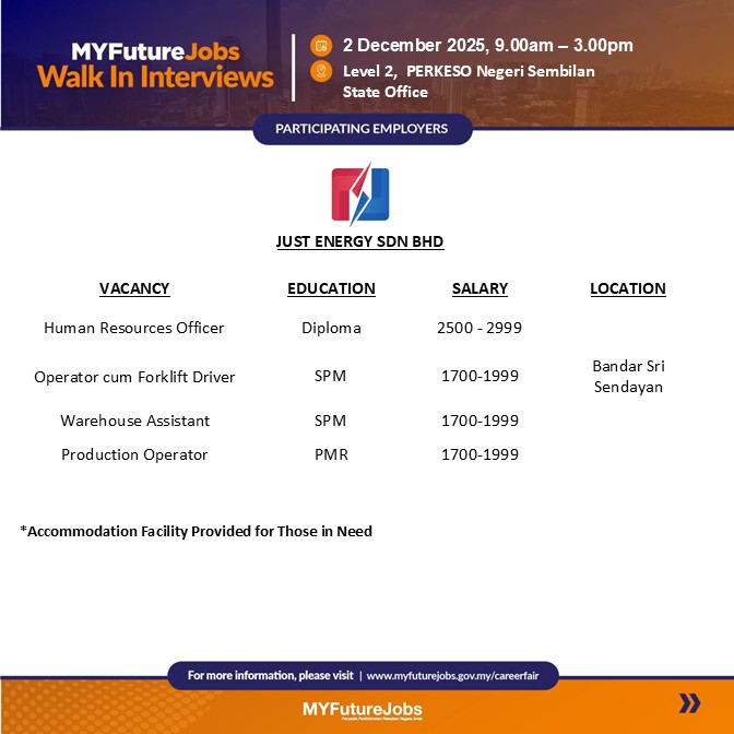 📌Lokasi : Pusat Satelit MYFutureJobs, Tingkat 2, UTC Ampangan Seremban