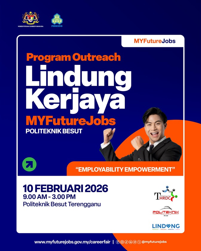 Jom ramai-ramai kita ke PROGRAM LINDUNG KERJAYA MYFUTUREJOBS x POLITEKNIK BESUT “EMPLOYABILITY EMPOWERMENT”.