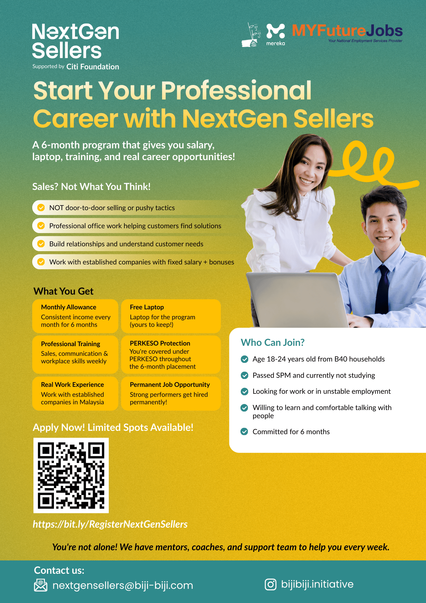 Program NextGen Sellers ialah program pembangunan kerjaya selama 6 bulan yang menyediakan latihan, penempatan kerja dalam bidang sales, elaun bulanan, dan perlindungan PERKESO kepada golongan belia, khususnya daripada latar belakang B40.