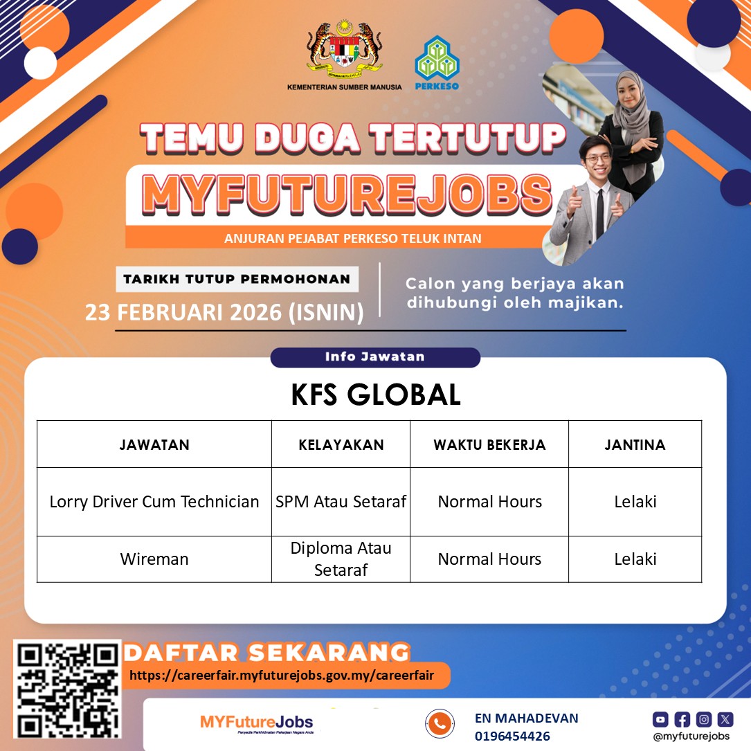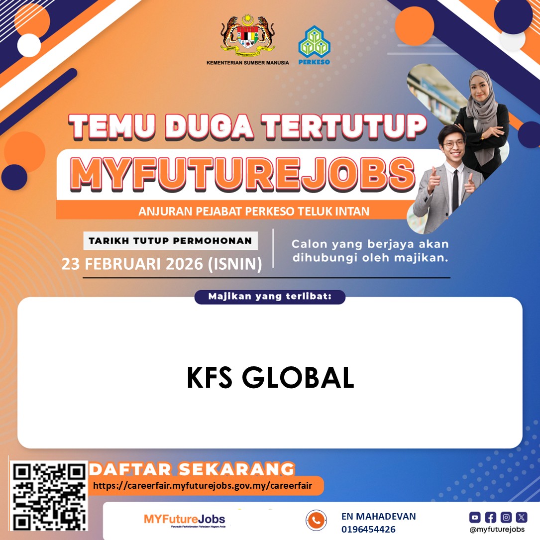 PERKESO Teluk Intan dengan kerjasama KFS GLOBAL akan mengadakan Temu Duga Tertutup MYFutureJobs bagi mengisi kekosongan jawatan seperti berikut: