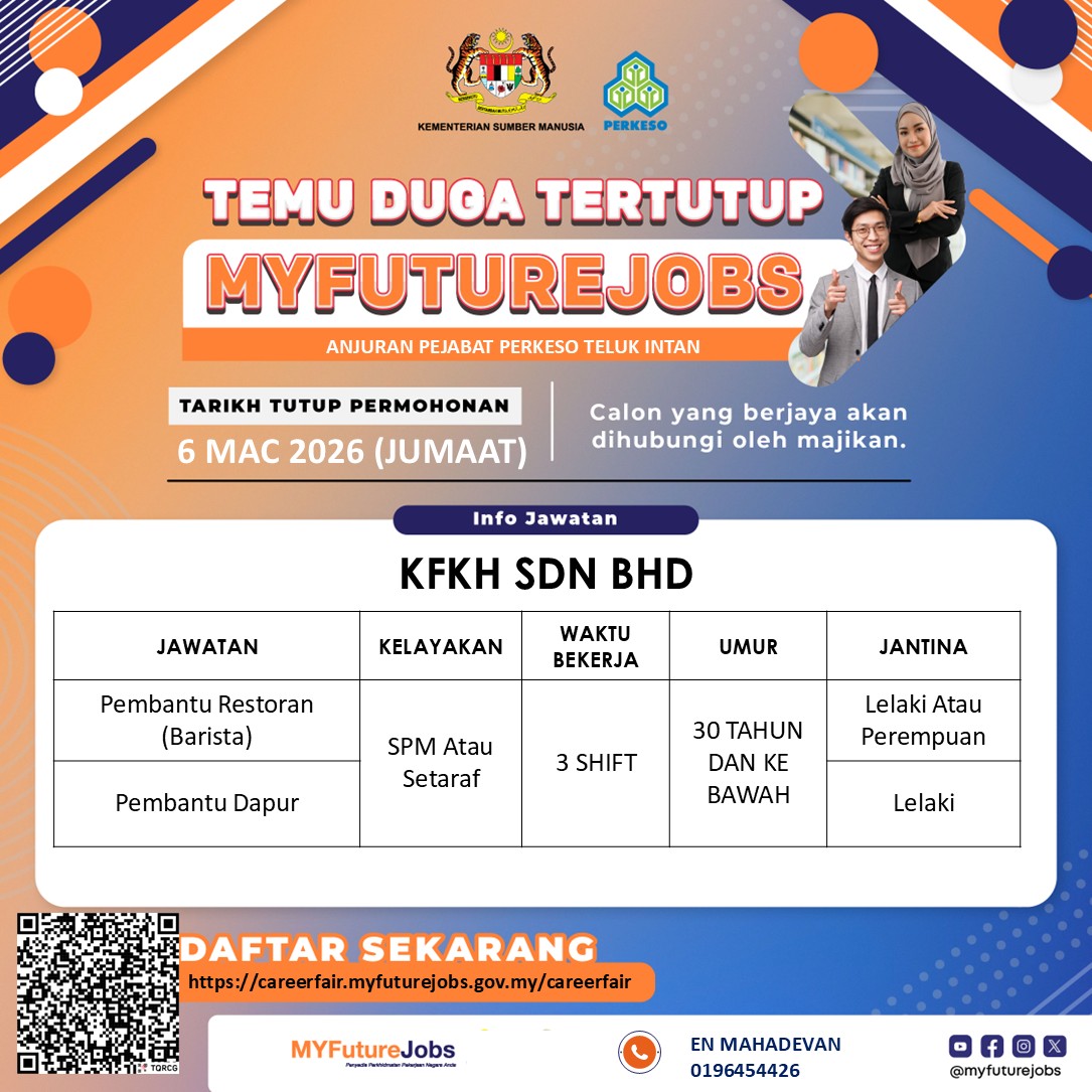 PERKESO Teluk Intan dengan kerjasama KFKH SDN BHD akan mengadakan Temu Duga Tertutup MYFutureJobs bagi mengisi kekosongan jawatan seperti berikut: