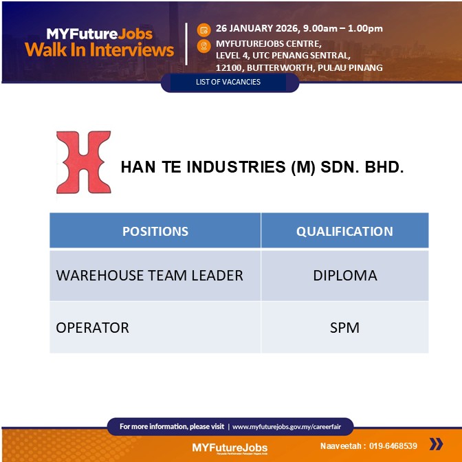 TEMUDUGA TERBUKA MYFUTUREJOBS BERSAMA MAJIKAN HAN TE INDUSTRIES (M) SDN BHD