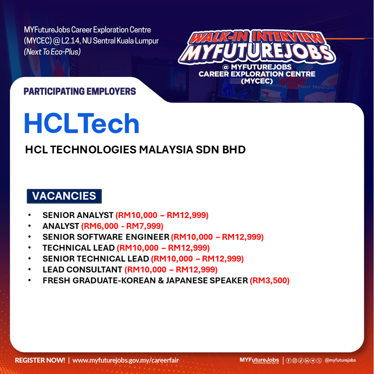 WALK-IN INTERVIEW @ MYFUTUREJOBS CAREER EXPLORATION CENTRE (MYCEC) WITH HCL TECHNOLOGIES MALAYSIA SDN BHD