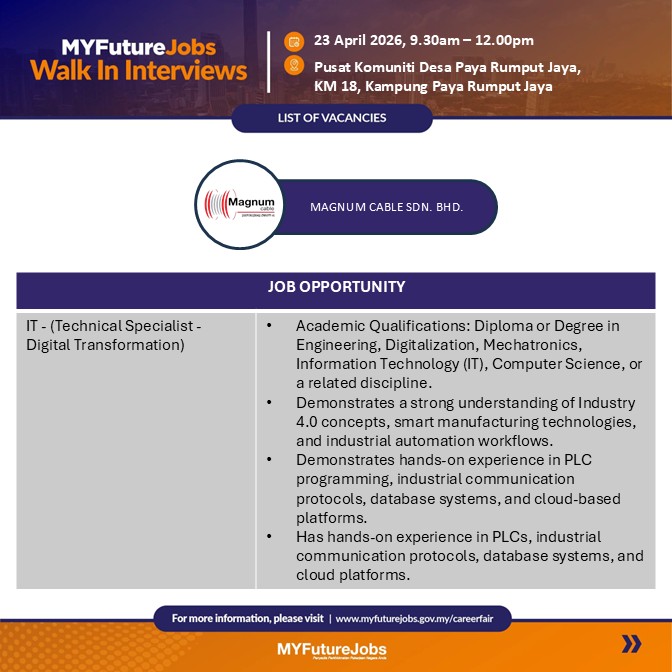 WALK-IN INTERVIEW MYFUTUREJOBS – MAGNUM CABLE SDN. BHD.