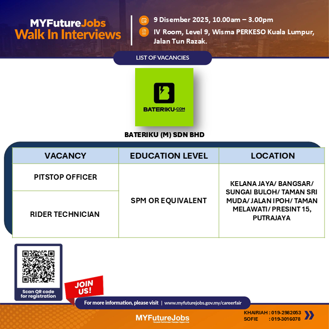 JOIN US FOR WALK-IN INTERVIEW MYFUTUREJOBS WITH BATERIKU (M) SDN BHD